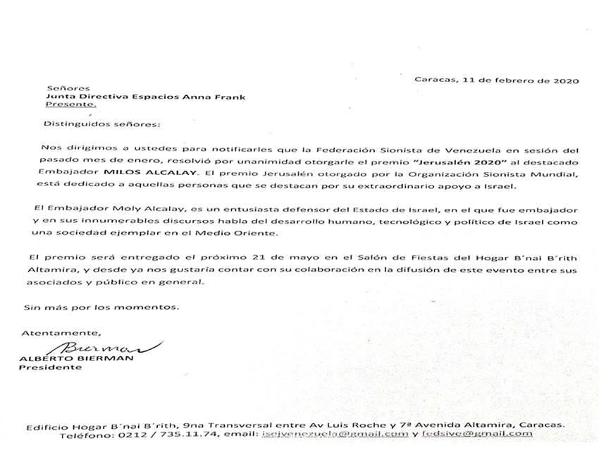 a la Universidad Católica Andrés Bello UCAB. Recibe el galardón su Profesor Lic. Carlos de Armas. Evento de importancia internacional que premia la labor desarrollada por el mencionado Profesor y su equipo en pro de la inclusión, la tolerancia y el combate del antisemitismo.